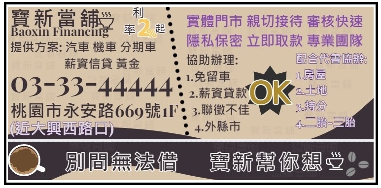 - 對顧客而言,蘆竹寶新當舖包辦了汽車機車借款、協助房屋二胎貸款、薪資信貸及債務整合及信貸等多元方便金融服務,並以專業態度協助顧客安心面對財務難關,絕對是值得相信的財務夥伴,若您有相關需求,了解更多中壢桃園區合法當舖推薦資訊,讓借貸服務成為改善生活品質的助力。